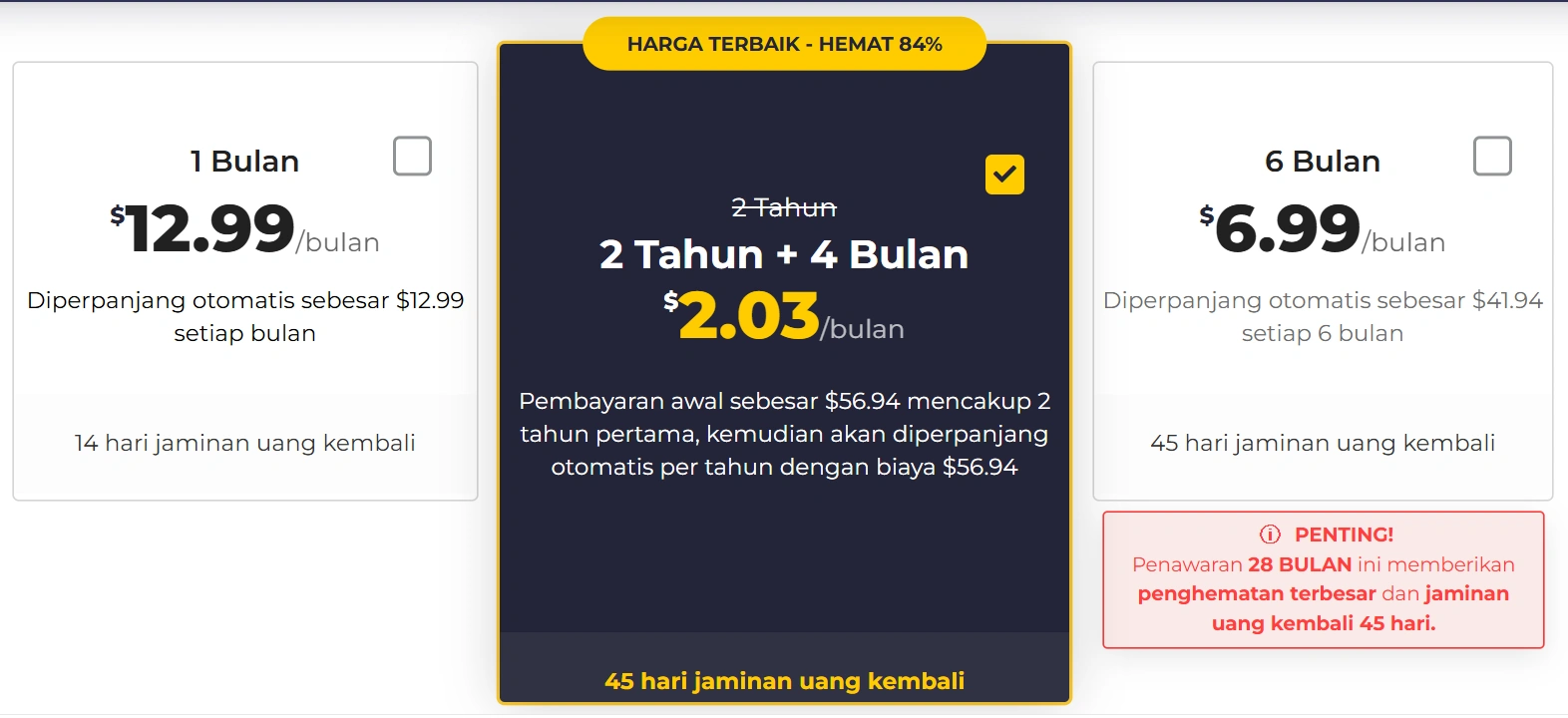 Paket paling hemat hanya US$2.19 per bulan (total sekitar US$56.94 untuk 2 tahun).