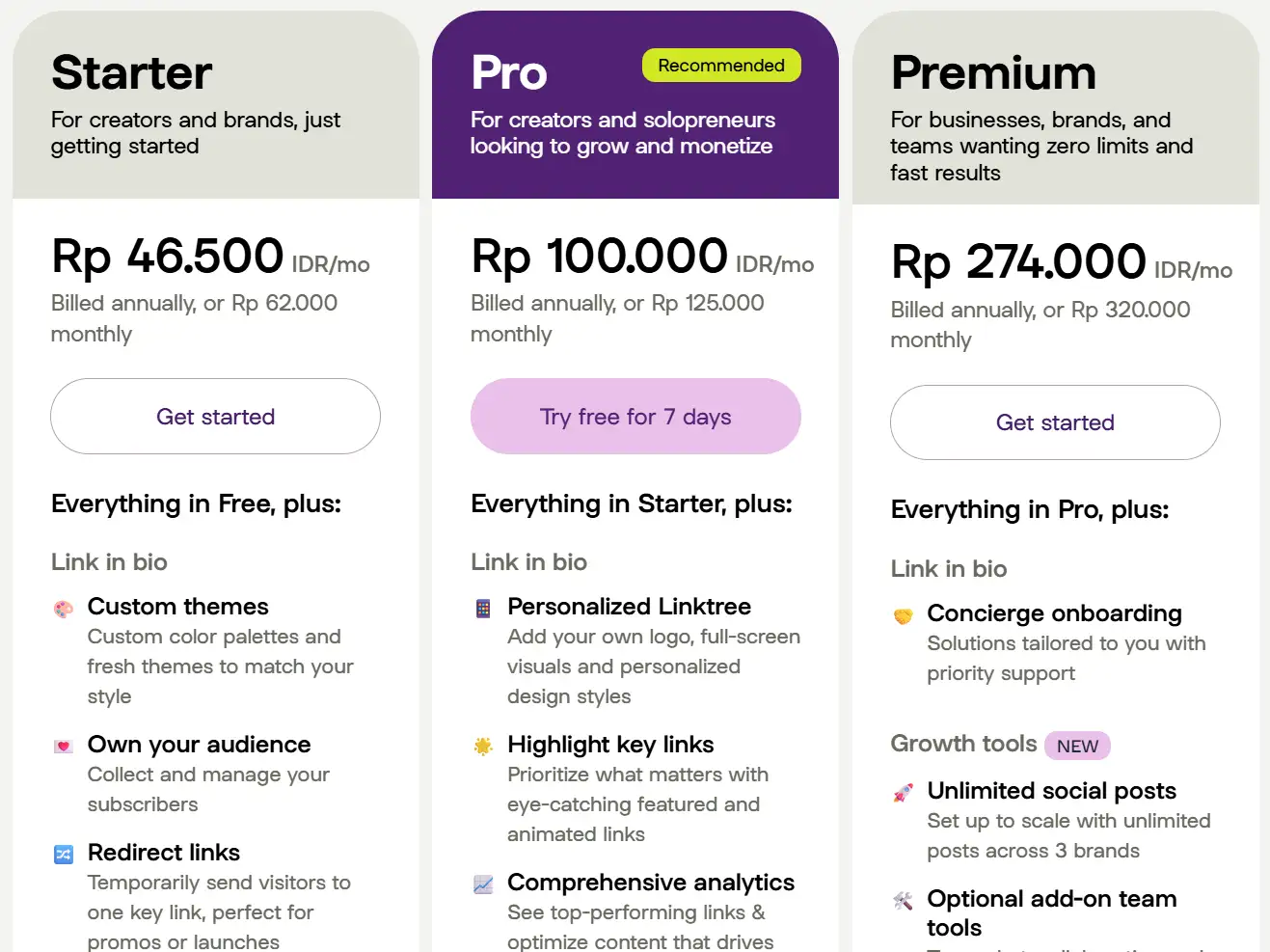 - Kalau kamu langganan Linktree Pro bulanan ($9), total jadi: (9 x 17.500) + 30.000 = Rp187.500