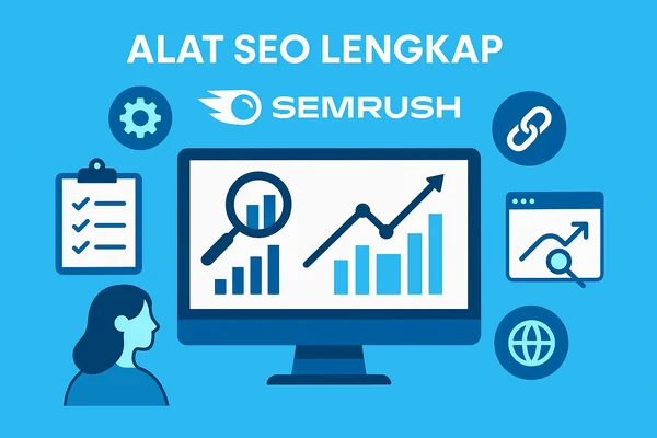 Semrush adalah alat bantu SEO dan digital marketing serbaguna yang dirancang untuk memudahkan kamu dalam memahami, mengelola, dan meningkatkan performa website kamu. Alat ini menawarkan berbagai fitur seperti riset keyword, analisis backlink, audit teknikal website, dan strategi konten, semuanya dalam satu dashboard yang ramah pengguna. Jadi ibarat kamu punya satu dashboard buat ngintip semua hal penting tentang website kamu dan juga musuh bebuyutan alias kompetitor kamu.