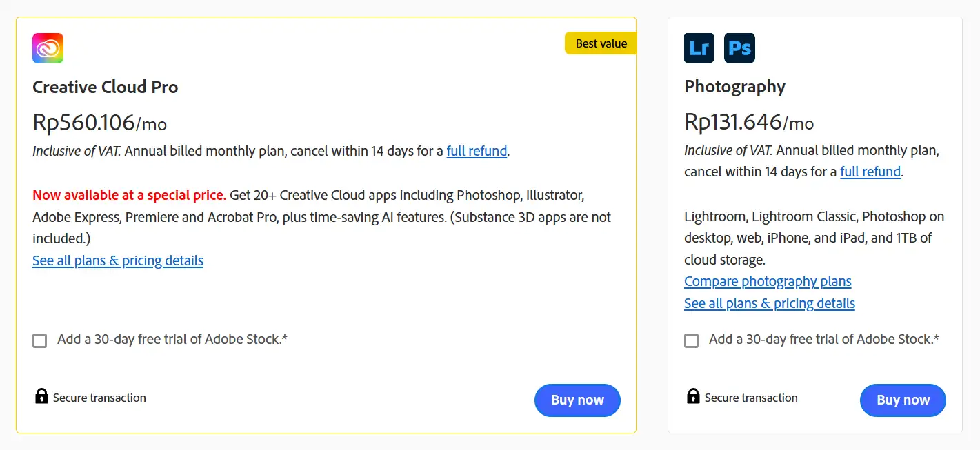 - Cek paket tahunan kalau kamu sering pakai Adobe karena harganya lebih hemat daripada bulanan.