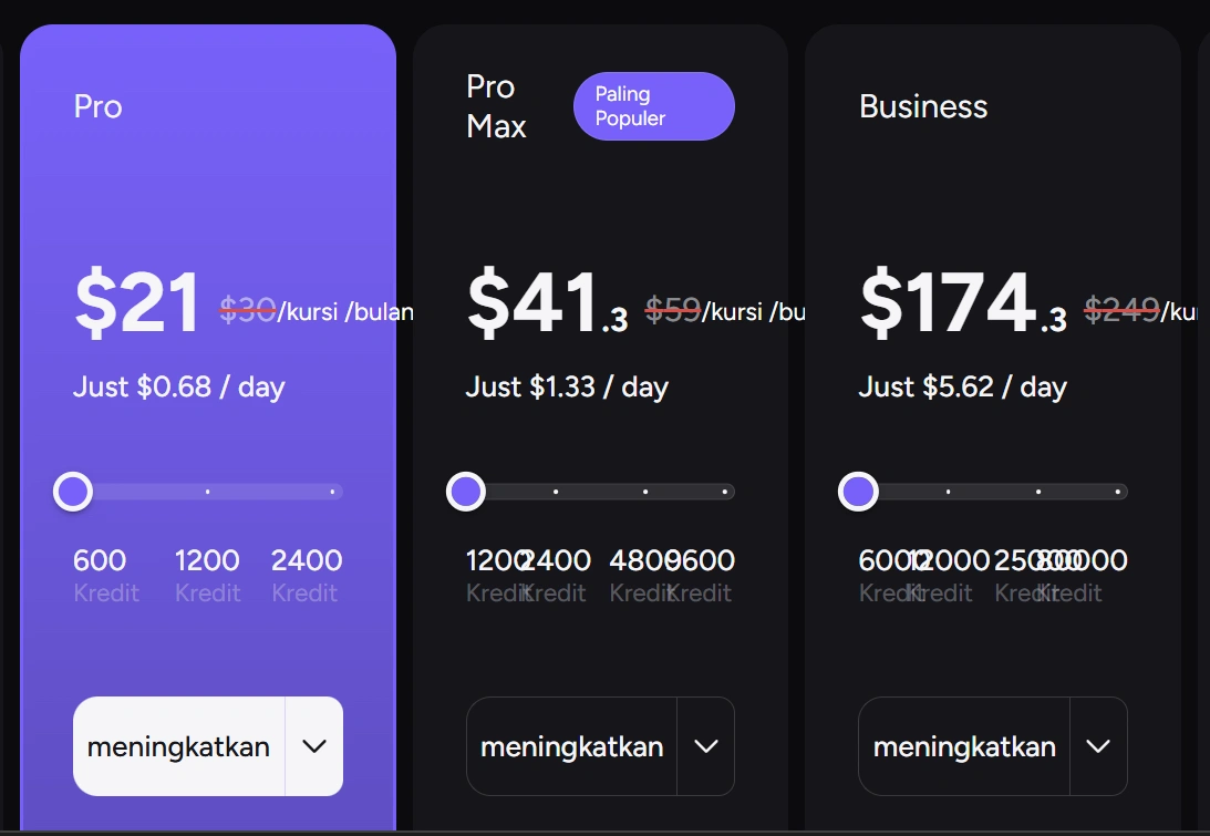 | Pro | ± $21 – $30 / bulan | ± 600 credits | Creator individu |