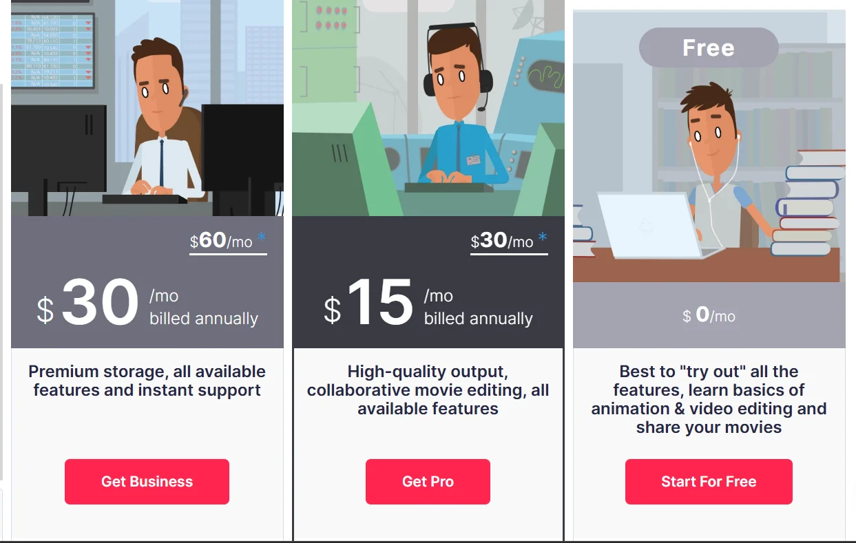 - Vyond lebih cocok buat animasi karakter bisnis dan storytelling profesional.