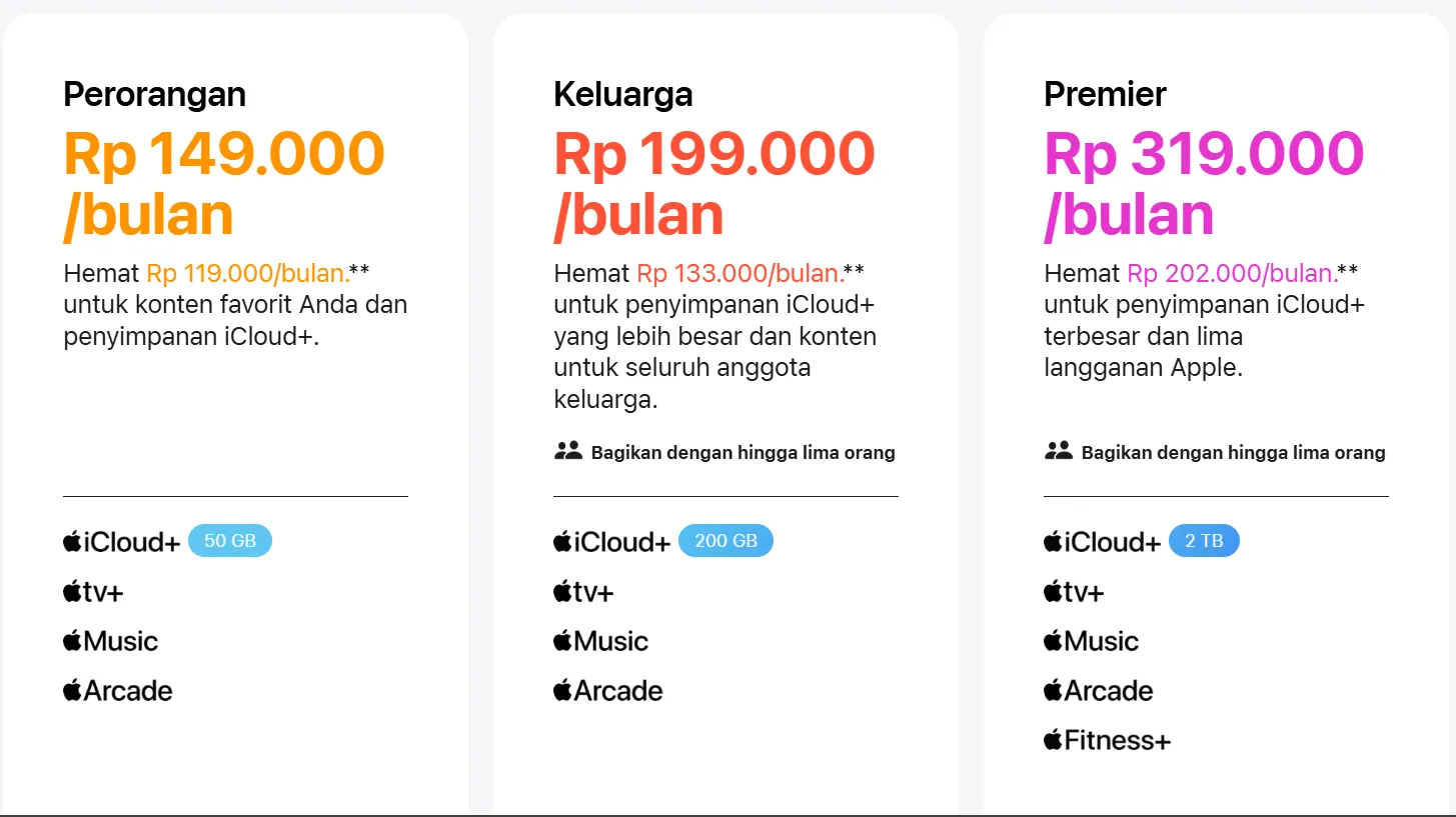 - Layanan: Semua layanan dari Individual, plus iCloud 200 GB dan sharing untuk 6 akun