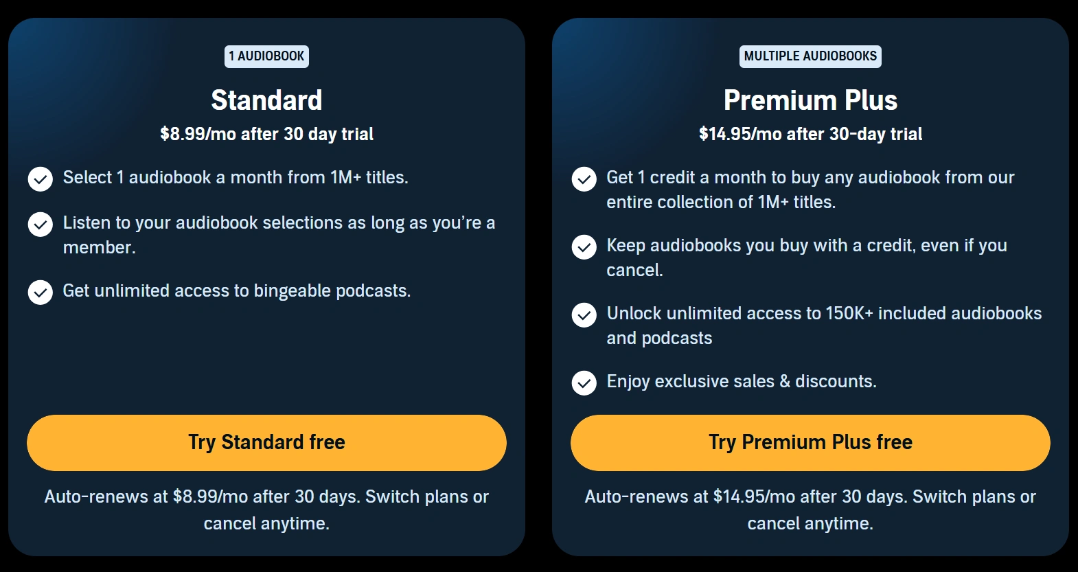 Audible Premium Plus adalah paket berlangganan berbayar yang memberikan: