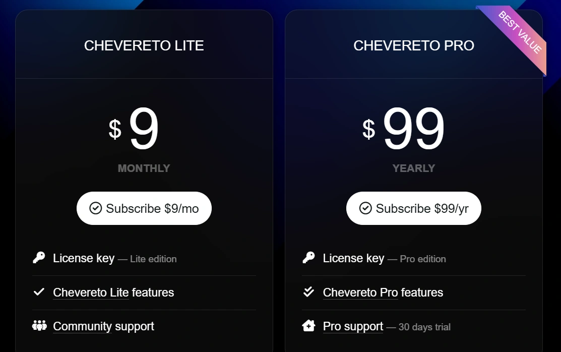 Saat ini Chevereto menyediakan dua paket langganan utama yang paling banyak digunakan, yaitu Chevereto Lite dan Chevereto Pro.
