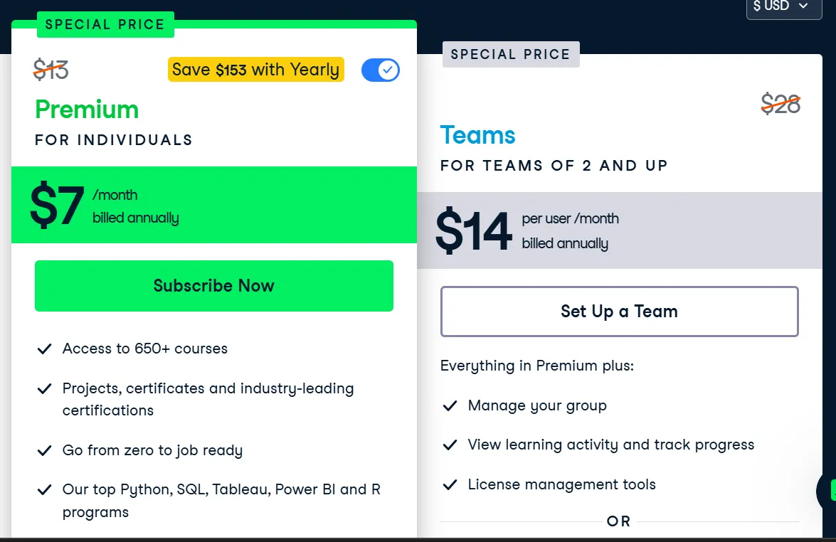 Kalau kamu tipe yang pengen coba-coba dulu, paket ini cocok banget karena kamu cukup bayar $25 per bulan dan langsung bisa akses semua kursus dan track, fleksibel banget buat yang waktunya terbatas.