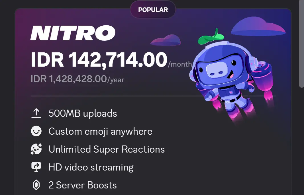 Nitro versi lengkap dengan harga $9.99 per bulan atau $99.99 per tahun, semua fitur premium lengkap dan dapet 2 server boost gratis.