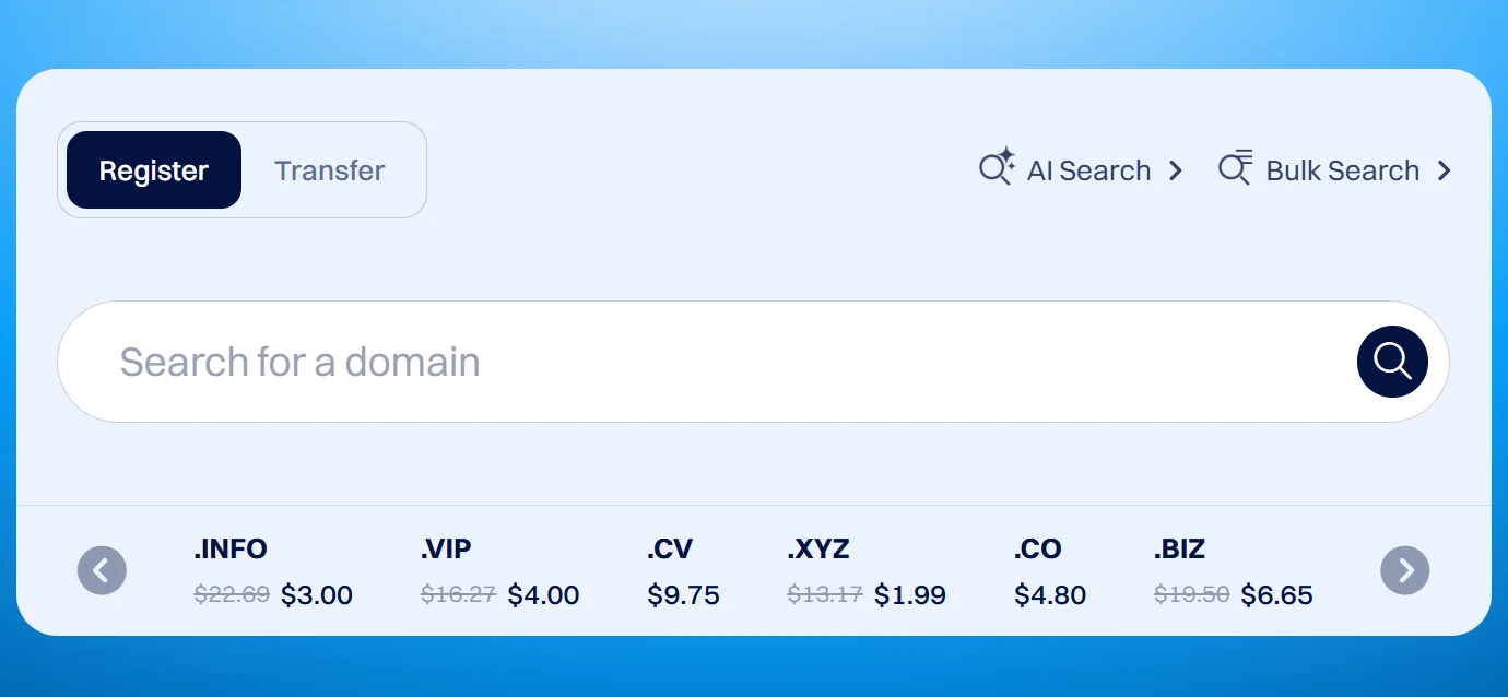 Ada fitur pencarian domain yang cepet banget, kamu bisa nyari nama domain favoritmu dan langsung keluar berbagai opsi TLD yang tersedia, plus saran alternatif kalau nama incaranmu udah diambil, lengkap sama info diskon yang lagi aktif.
