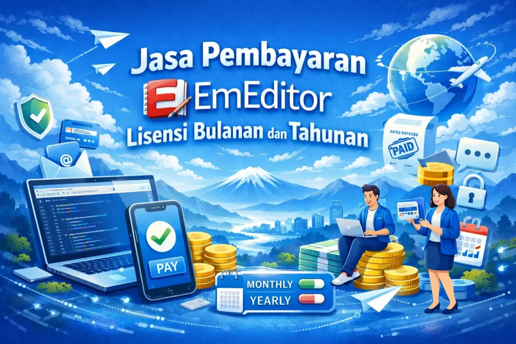 Di sinilah jasa pembayaran EmEditor menjadi solusi. Anda cukup membayar menggunakan metode lokal Indonesia seperti transfer bank, QRIS, atau e-wallet, lalu kami yang akan membantu menyelesaikan pembelian lisensi secara resmi di website EmEditor.