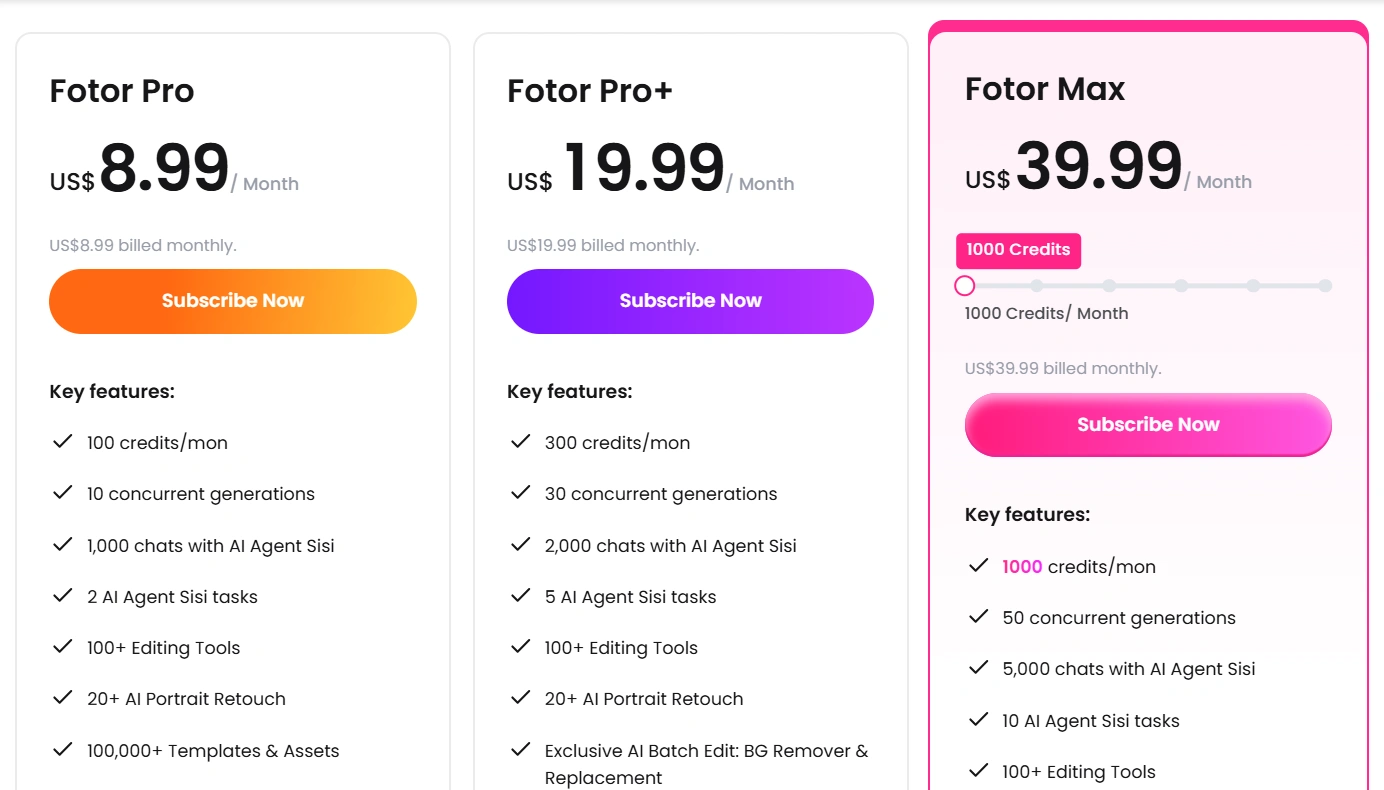 Versi gratisnya memang bisa digunakan, tetapi banyak fitur penting hanya tersedia di paket premium seperti Fotor Pro, Pro+, Max, dan pembelian Credits AI.