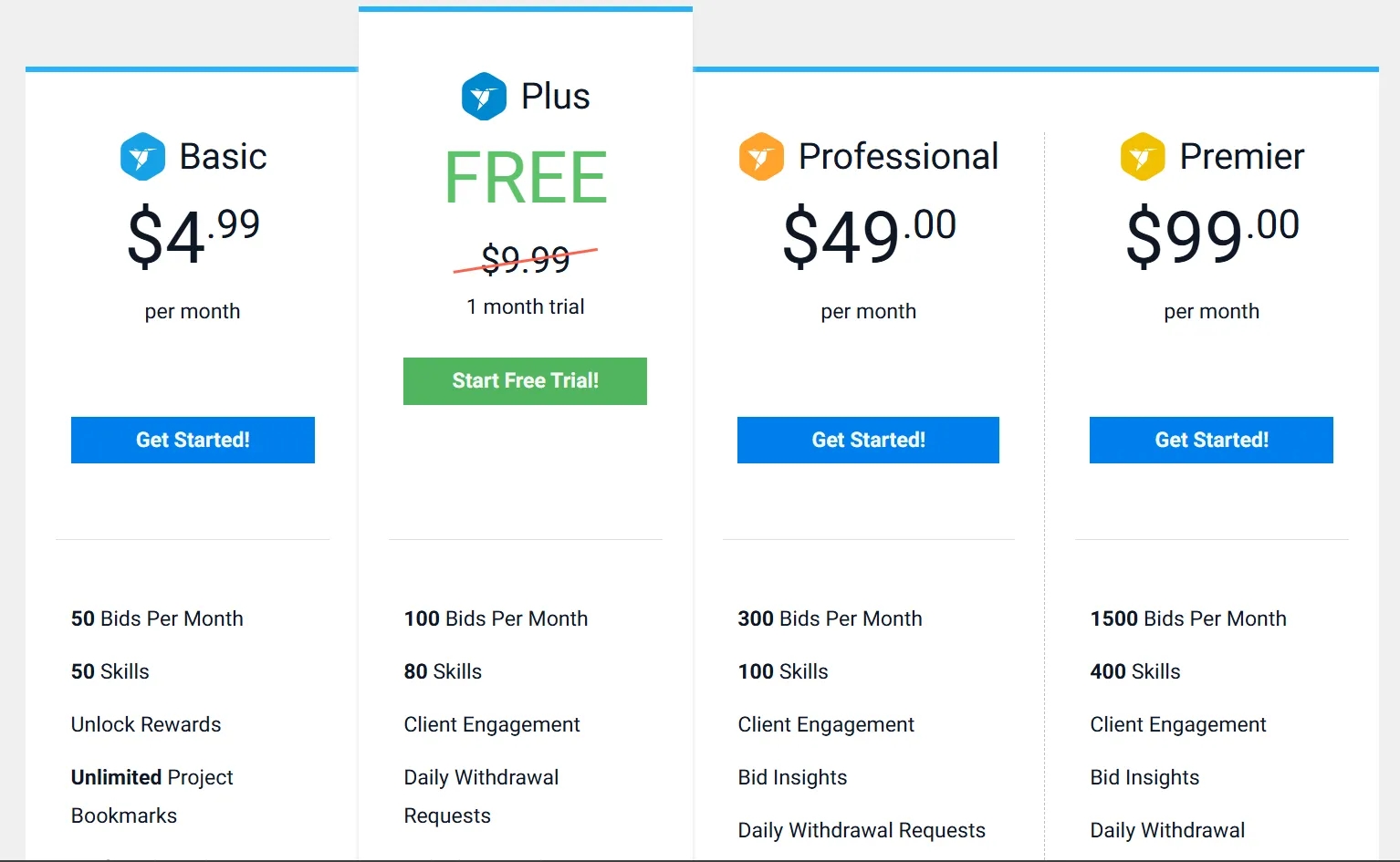 Freelancer bisa langganan bulanan mulai dari $4.95 sampai $59.95 buat dapet slot bidding lebih banyak dan akses proyek eksklusif.