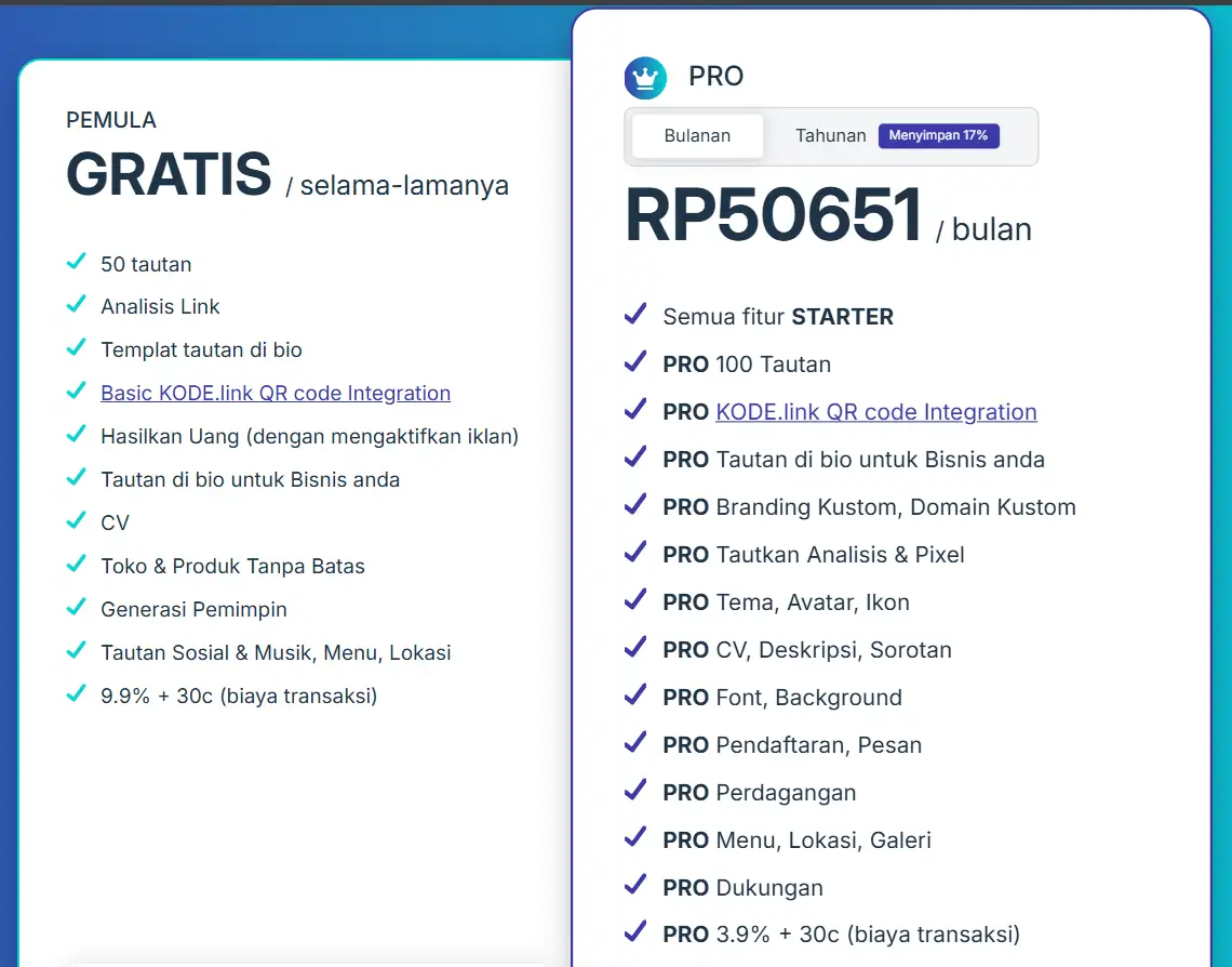 - Kalau kamu ambil paket Starter seharga $9 buat ngurusin semua link digital kamu yang berserakan, maka 9 dikali 17.500 terus tambah 30.000 hasilnya jadi Rp187.500 totalnya.