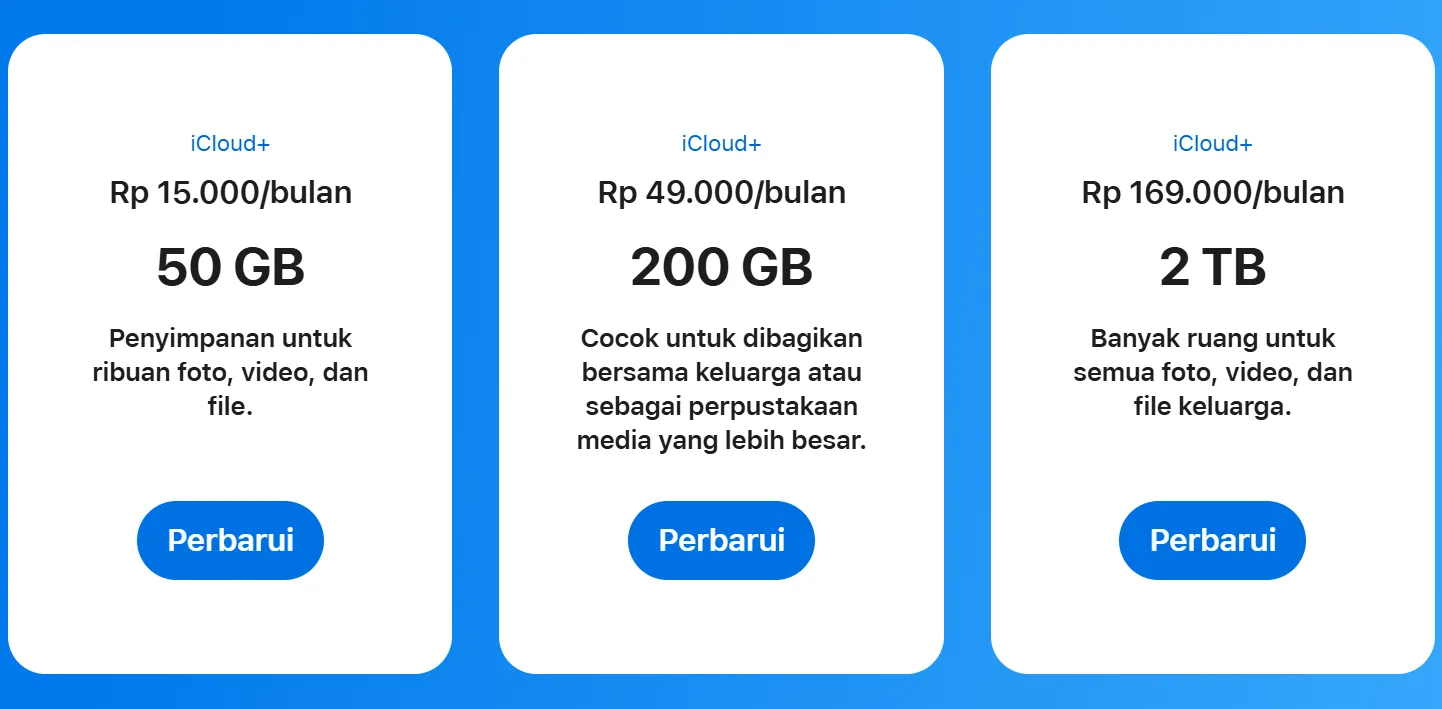 - Paket iCloud+ 50GB ($0.99): (0.99 × Rp17.500) + Rp30.000 = Rp47.325.