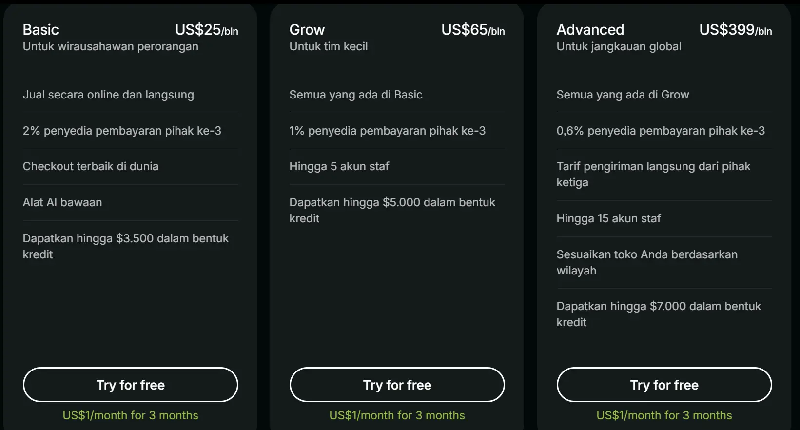 - Trial Shopify (1 USD): 1 x Rp17.500 + Rp30.000 = Rp47.500