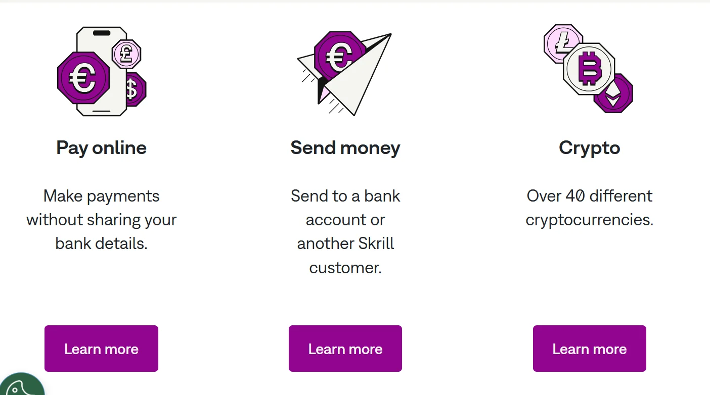 Skrill mendukung berbagai opsi isi saldo dan tarik dana: