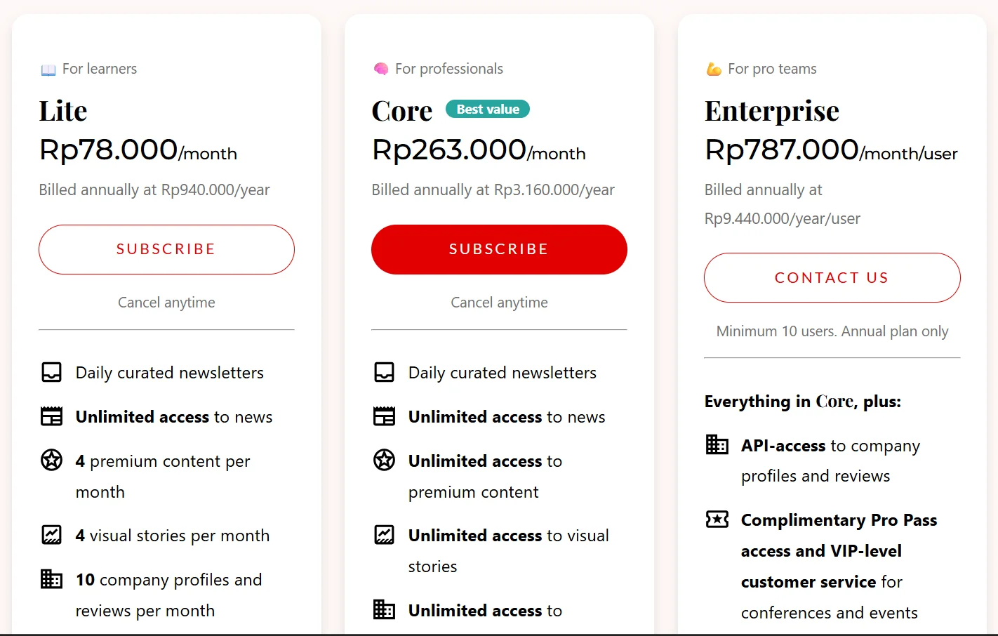 Paket dasar ini cocok buat pengguna yang baru kenalan dengan Tech in Asia dan belum butuh fitur lengkap.