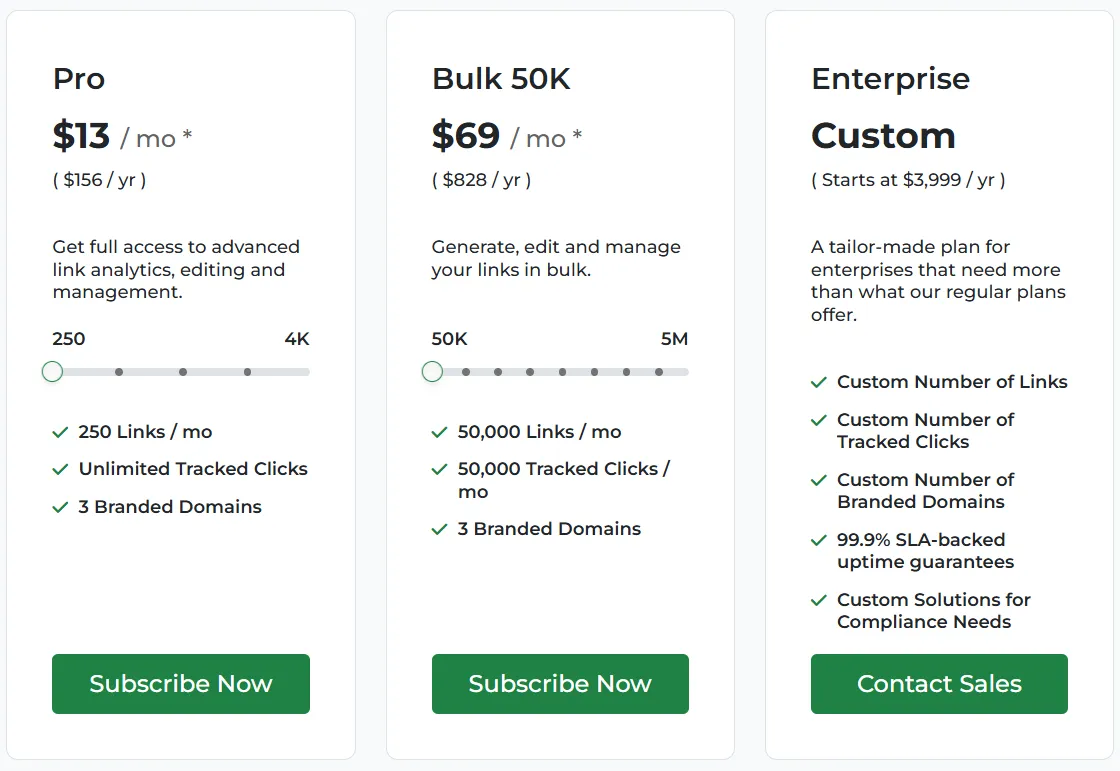 Khusus buat kamu yang kerja di agensi atau perusahaan yang motong link banyak banget tiap hari. Harga mulai dari $199 per bulan dengan fitur bulk shortening sampe 100.000 link.