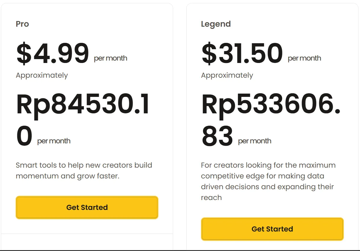- Paket Legend $39 = (39 x 17.500) + 30.000 = Rp712.500 ideal buat tim kreatif, agensi, atau yang urus lebih dari satu channel.