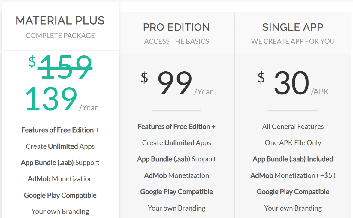 Website 2 APK Builder punya tiga pilihan lisensi. Semua lisensinya sekali bayar, bukan langganan tahunan. Jadi kamu beli sekali, pakai seumur hidup.