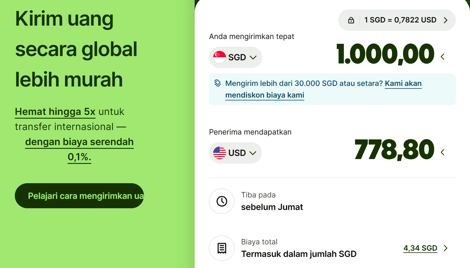Kamu bisa kirim uang ke lebih dari 70 negara dengan biaya kecil dan kurs yang sama kayak yang kamu liat di Google, bukan kurs versi “bank mahal”.