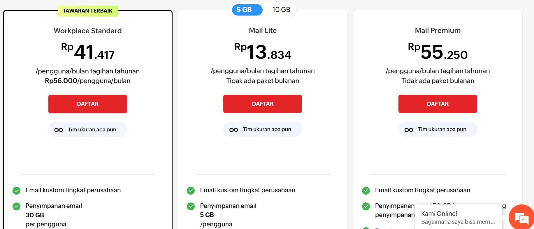 - Storage di paket Mail Lite cuma 5 GB per user.